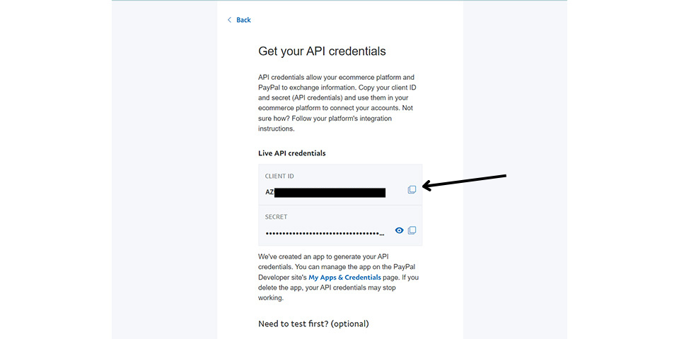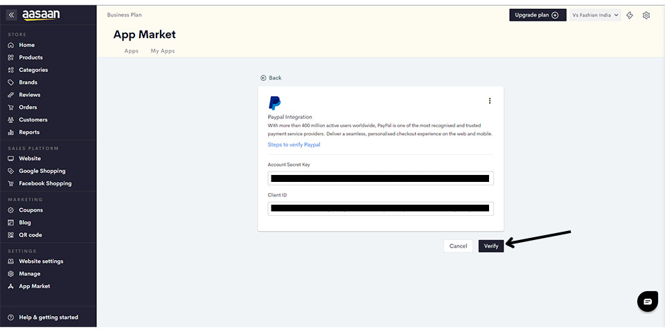 - Go to your installed Paypal app in aasaan. Enter your secret key and client ID in the respective fields and click on Verify.