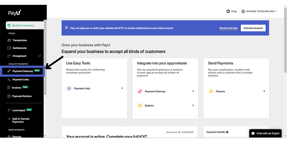 STEP 1:- Login to your PayU account and click on Payment Gateway.