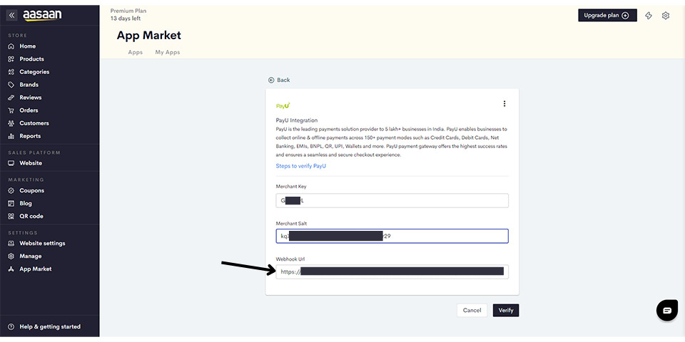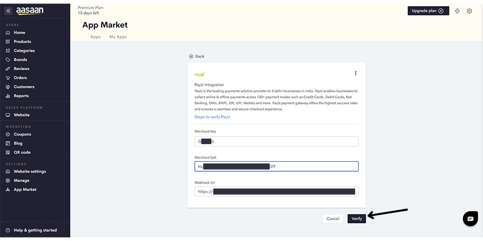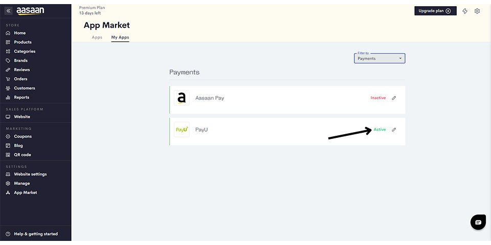 Setup PayU Payment Gateway on your StoreIntegrate PayU to your Store Note: Click here to navigate to the mobile admin app version of this article You can watch the video version of this article here. If you have an existing account with PayU payment gateway, you can easily integrate with Aasaan to receive your online payments. Here’s how you do it. Note: Make sure to install PayU from the aasaan app market. Click here to learn how to install apps from your app market.