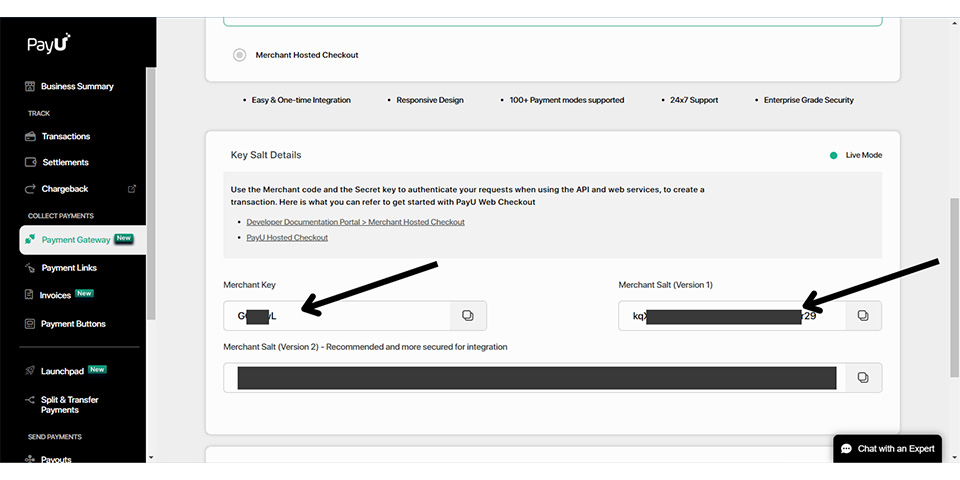 - Copy your Merchant Key and the Merchant Salt (Version 1).