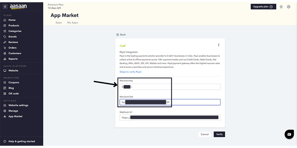 - Go to your installed PayU app in aasaan. Paste the merchant key and merchant salt.