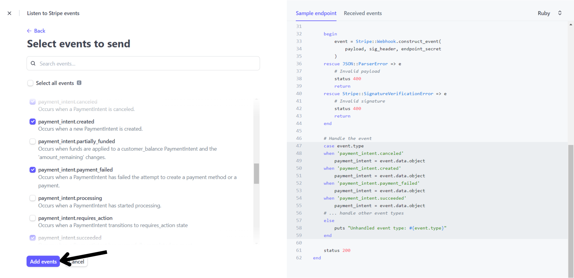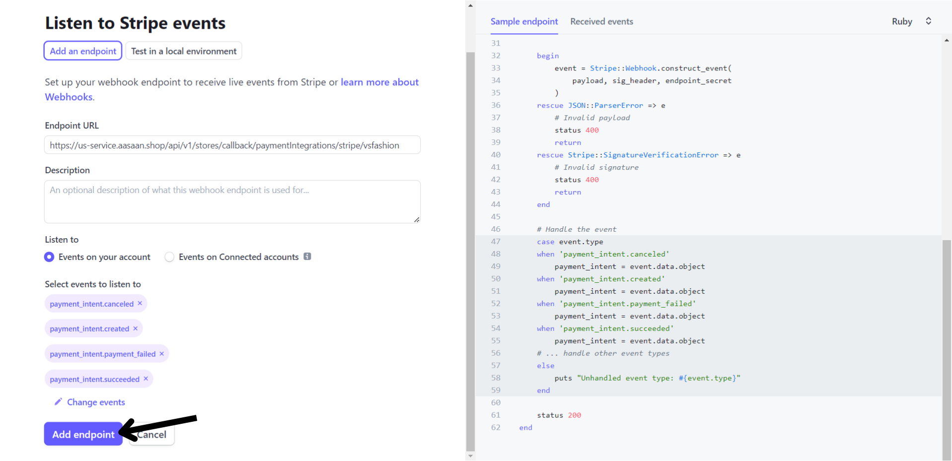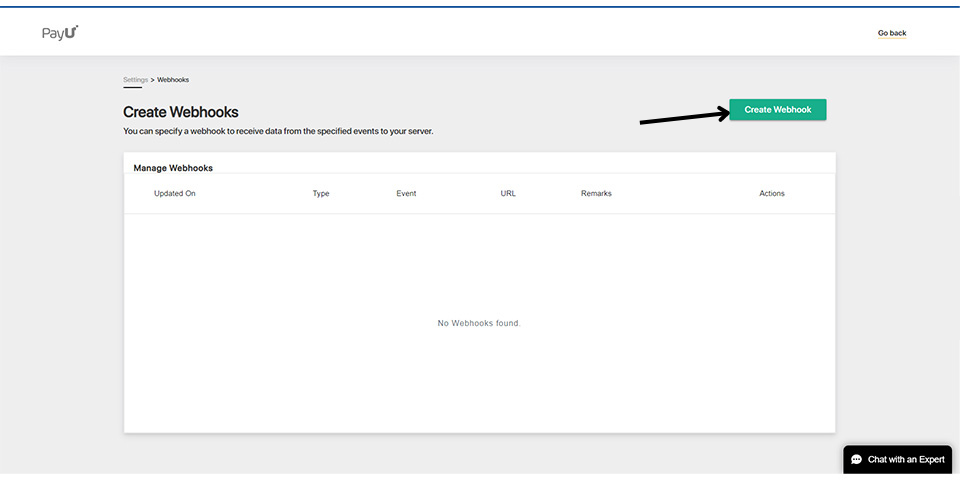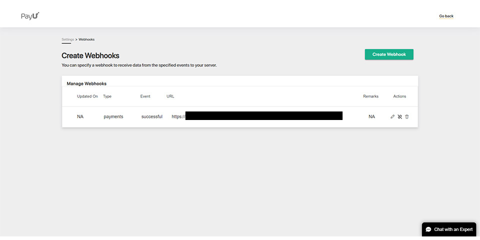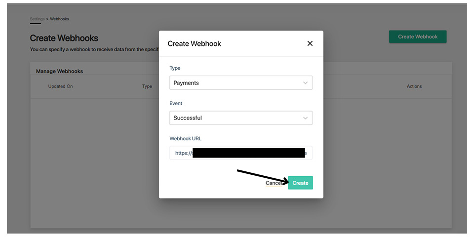 - Select the type as Payments and the Event as Successful. Enter the Webhook URL and click on Create.