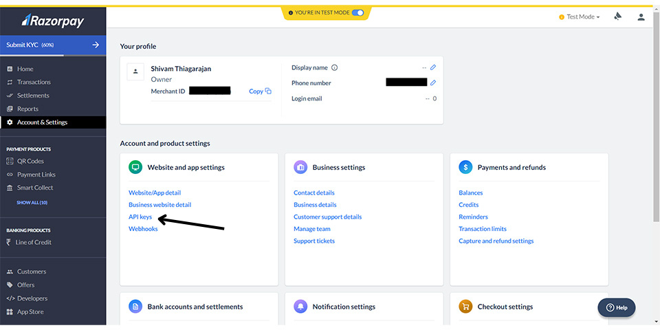 STEP 1:- Login to your existing Razorpay account and click on Account & Settings > API Keys.