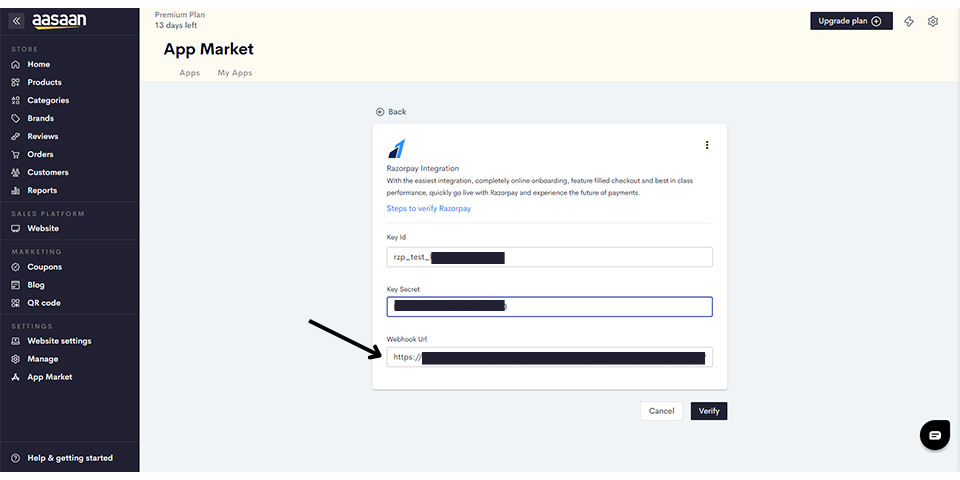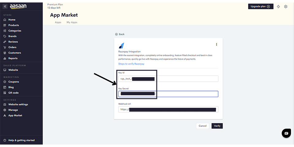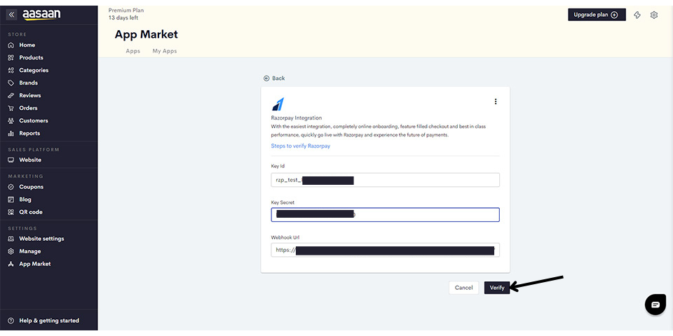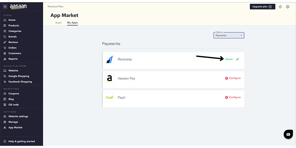 How to Integrate Razorpay to aasaanSet up Razorpay on your Store Note: Click here to navigate to the mobile admin app version of this article You can watch the video version of this article here. Our regular method of setting up online payments involves setting up aasaan Pay by entering your bank account details. This works if you don’t have a payment gateway account like Razorpay. Note: Make sure to install Razorpay from the aasaan app market. Click here to learn how to install apps from your app market.