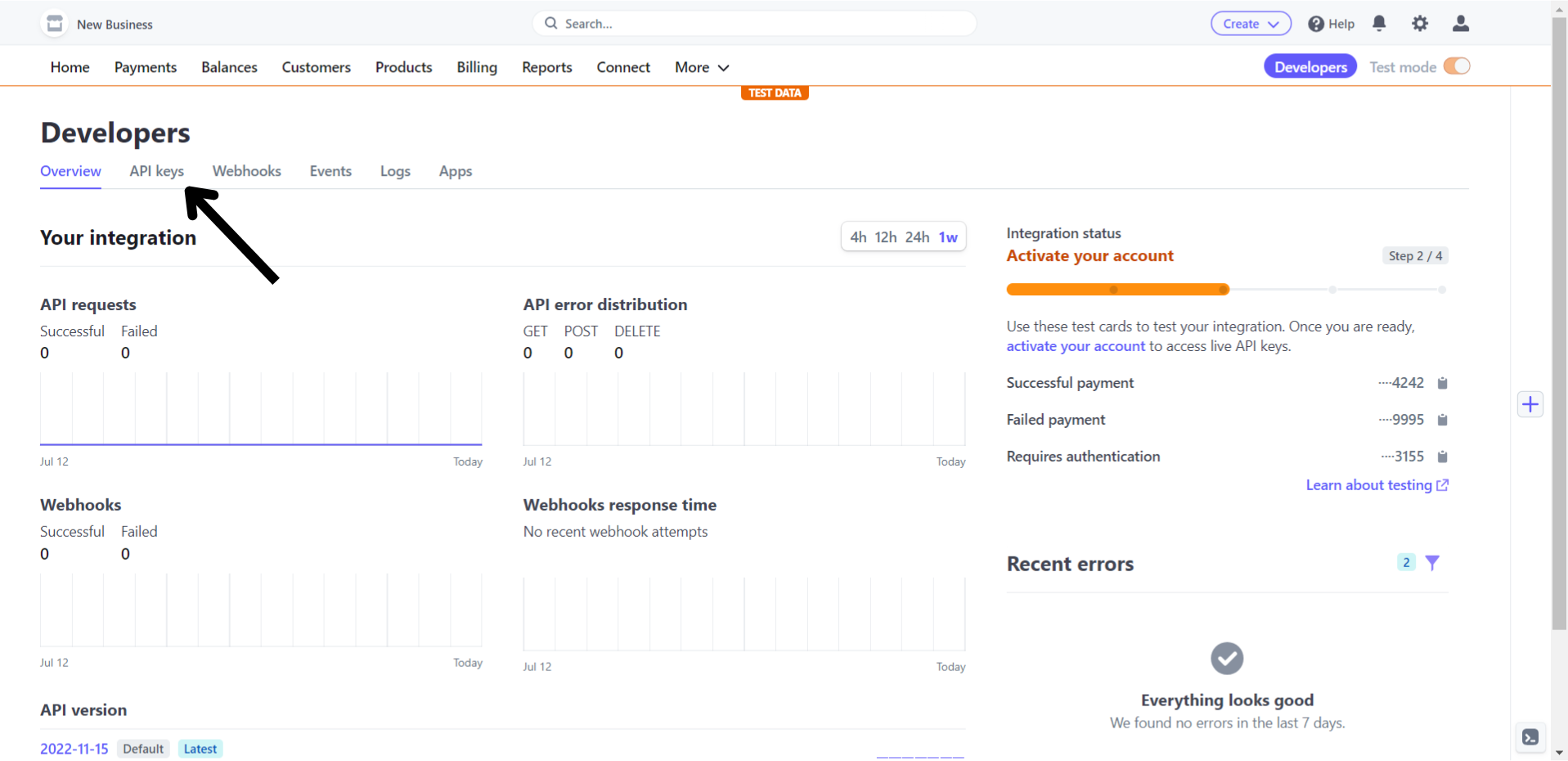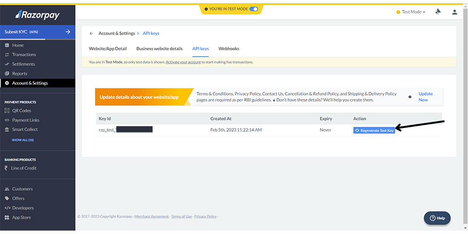 - Since we already have existing API keys and need new ones, click on Regenerate Test Key.