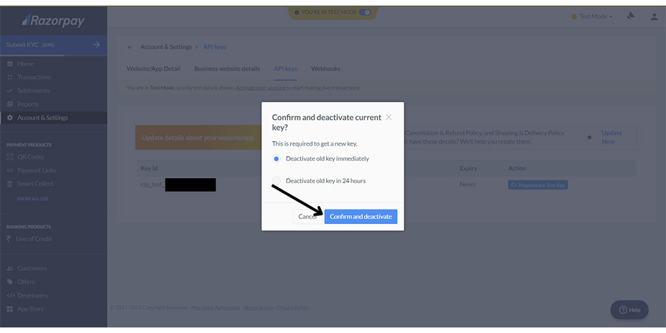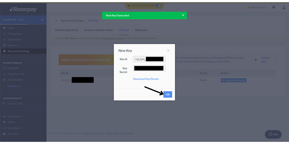- Copy and save your Key ID and Key Secret. You can download them by clicking on Download Key Details.