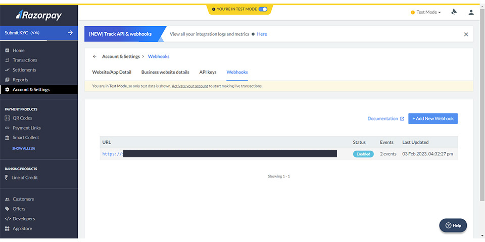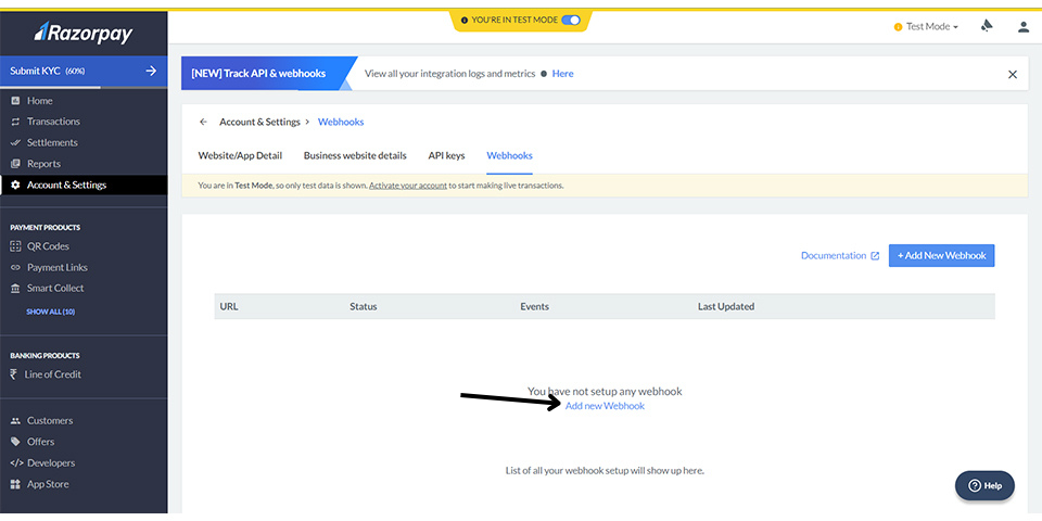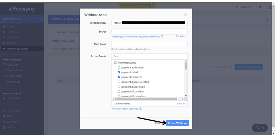 - In your Razorpay settings, click on Webhooks > Add New Webhook.