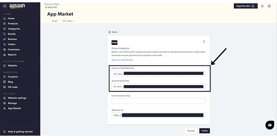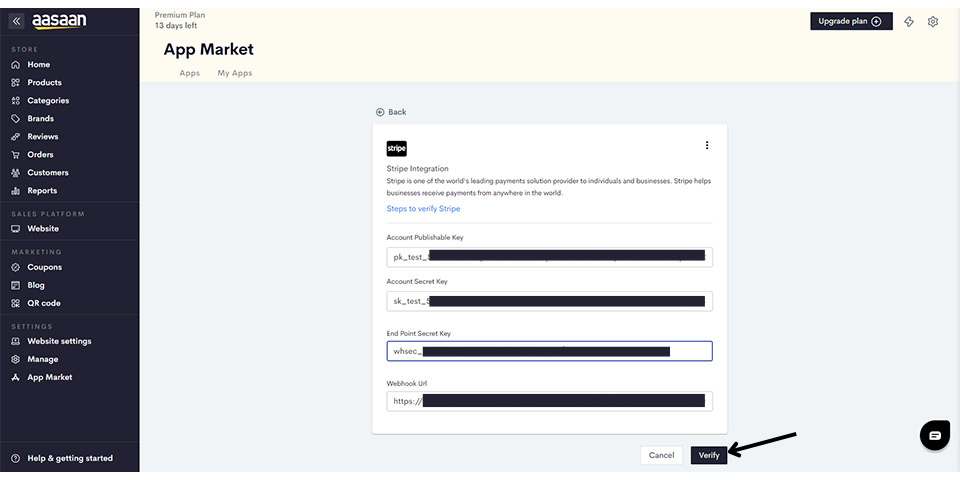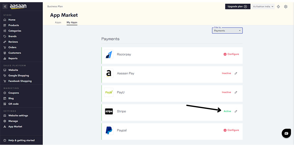 How to Set up Stripe Payment Gateway on Your WebsiteSet up Stripe Payment Gateway on your Store Note: Click here to navigate to the mobile admin app version of this article You can watch the video version of this article here. If you have an existing account with the Stripe payment gateway, you can easily integrate it with Aasaan to receive your online payments. Here’s how you do it. Note: Make sure to install Stripe from the aasaan app market. Click here to learn how to install apps from your app market.