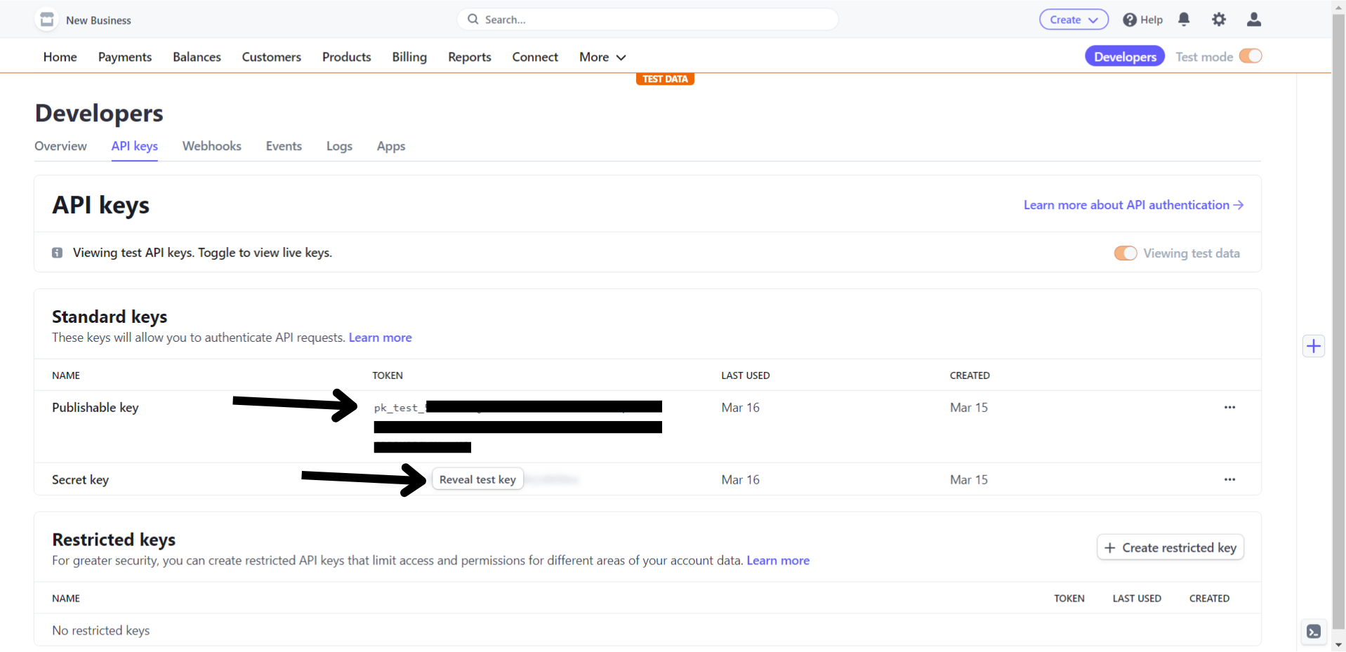 - Copy the publishable key and secret key and save them. The secret key will only be displayed once.