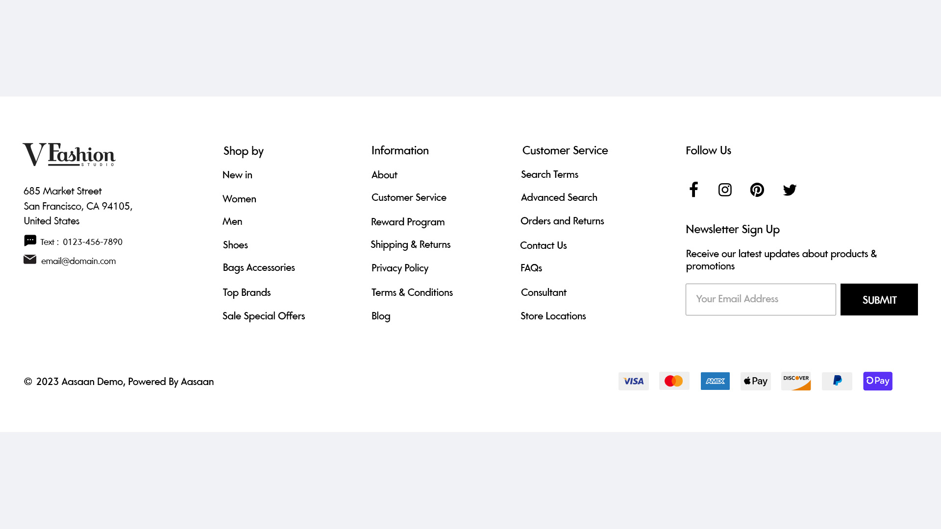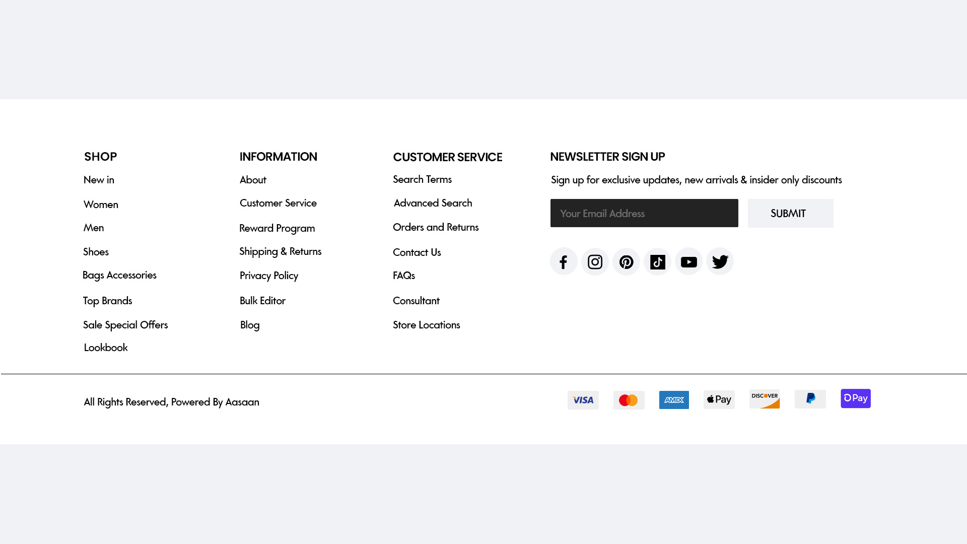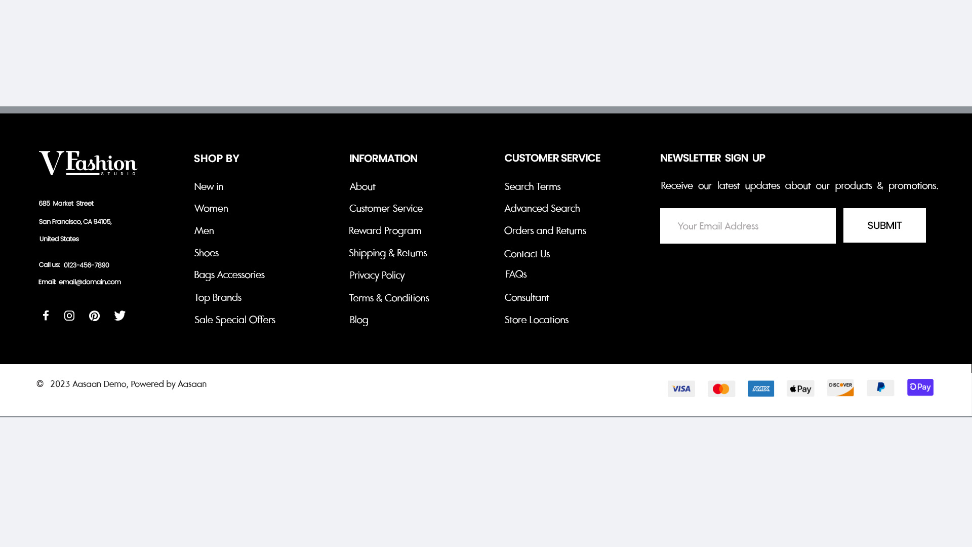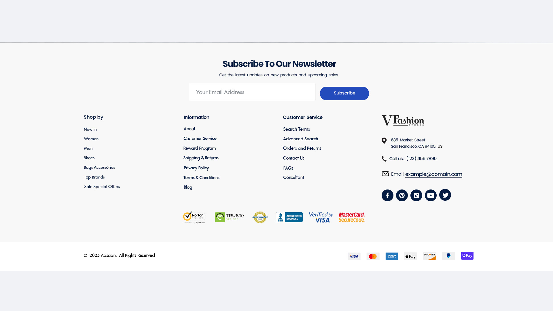 - Compliance: Details legal and policy information including terms of service, privacy policy, and returns.