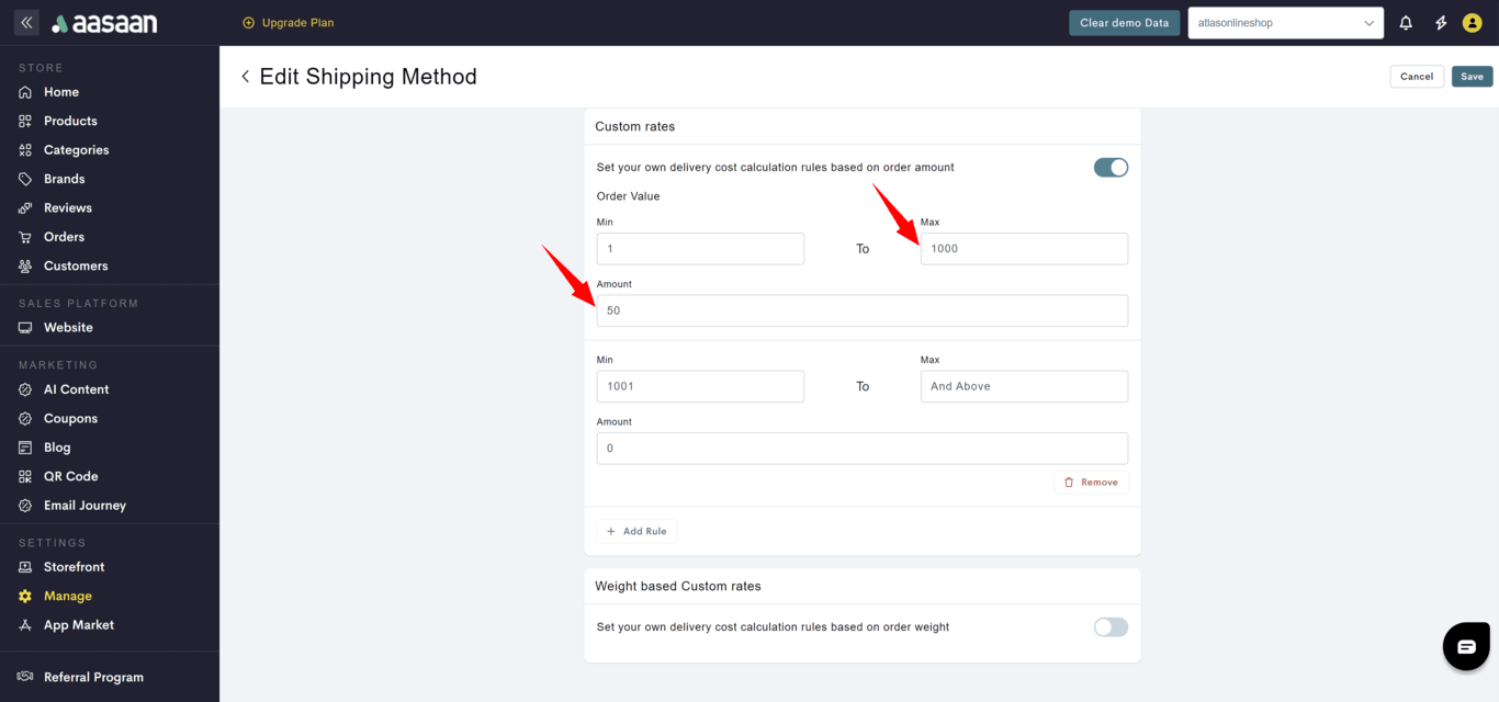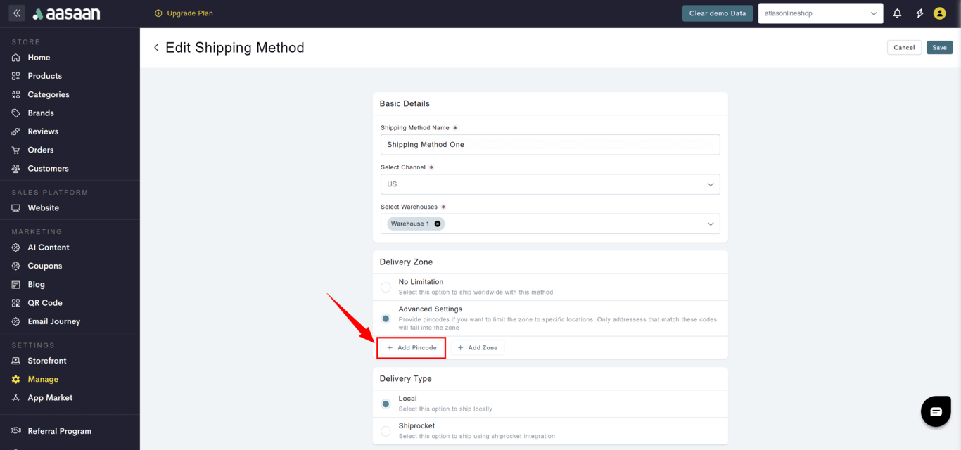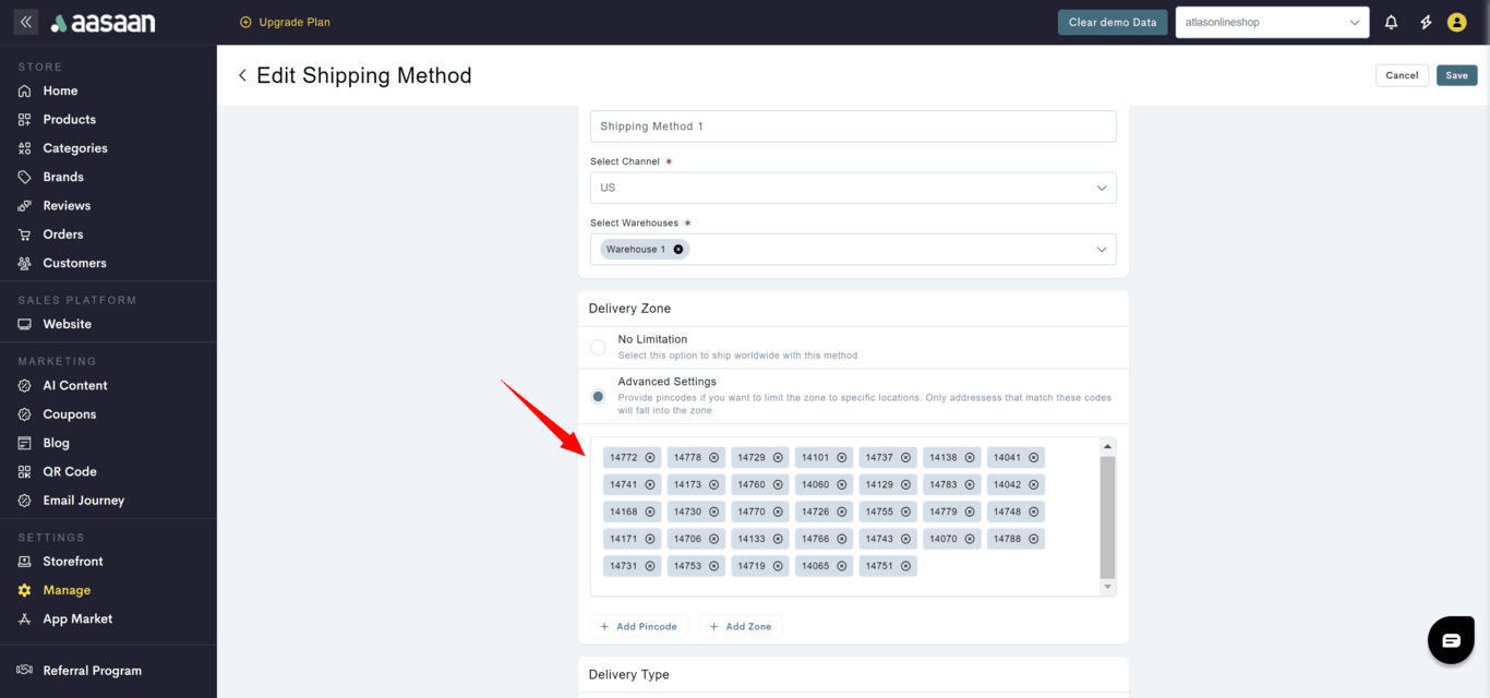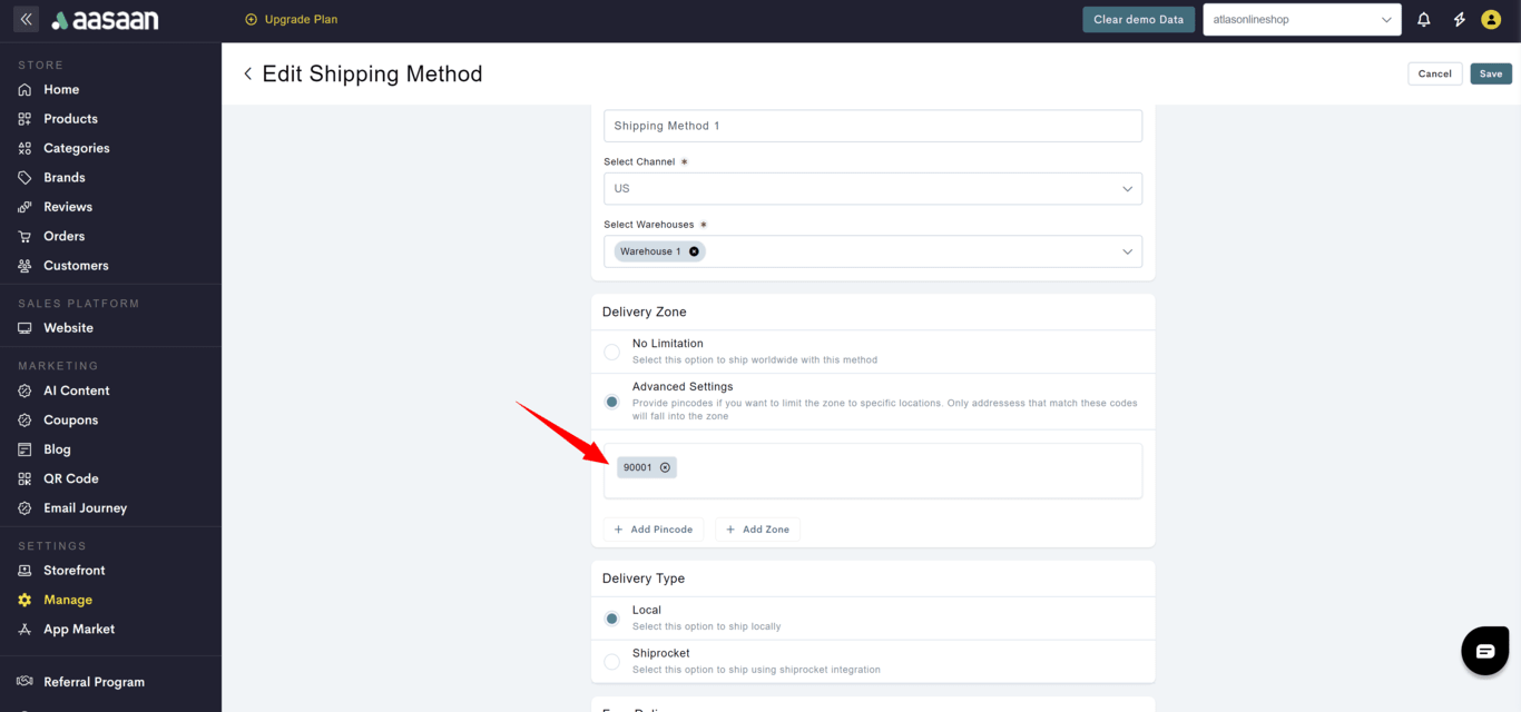 Here you can configure your delivery settings for your store. Enter the name of the shipping method, and select the warehouse(s) it will apply to.