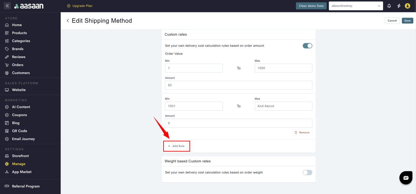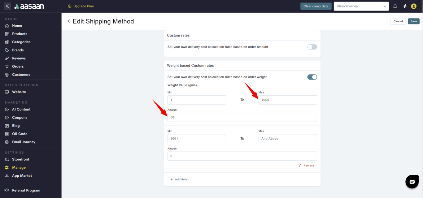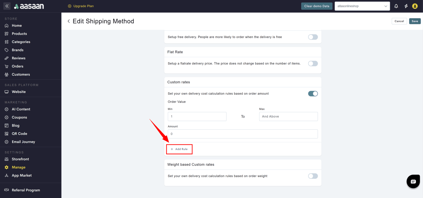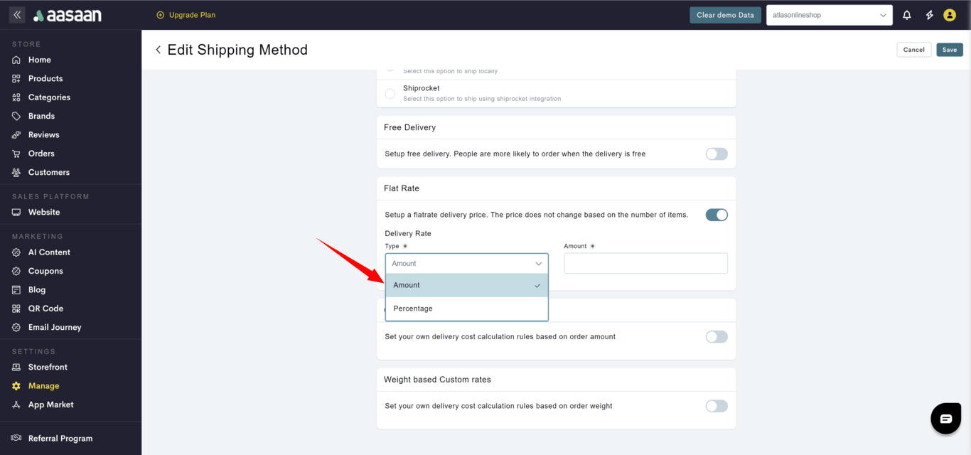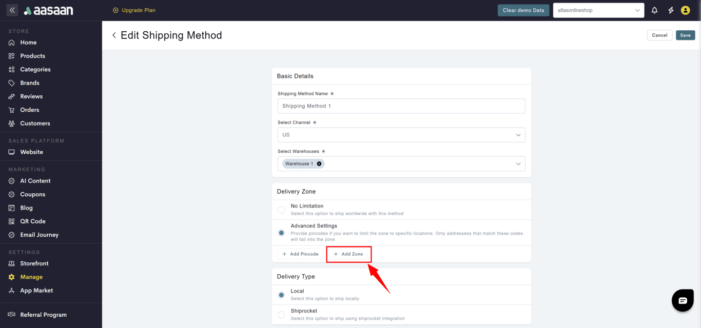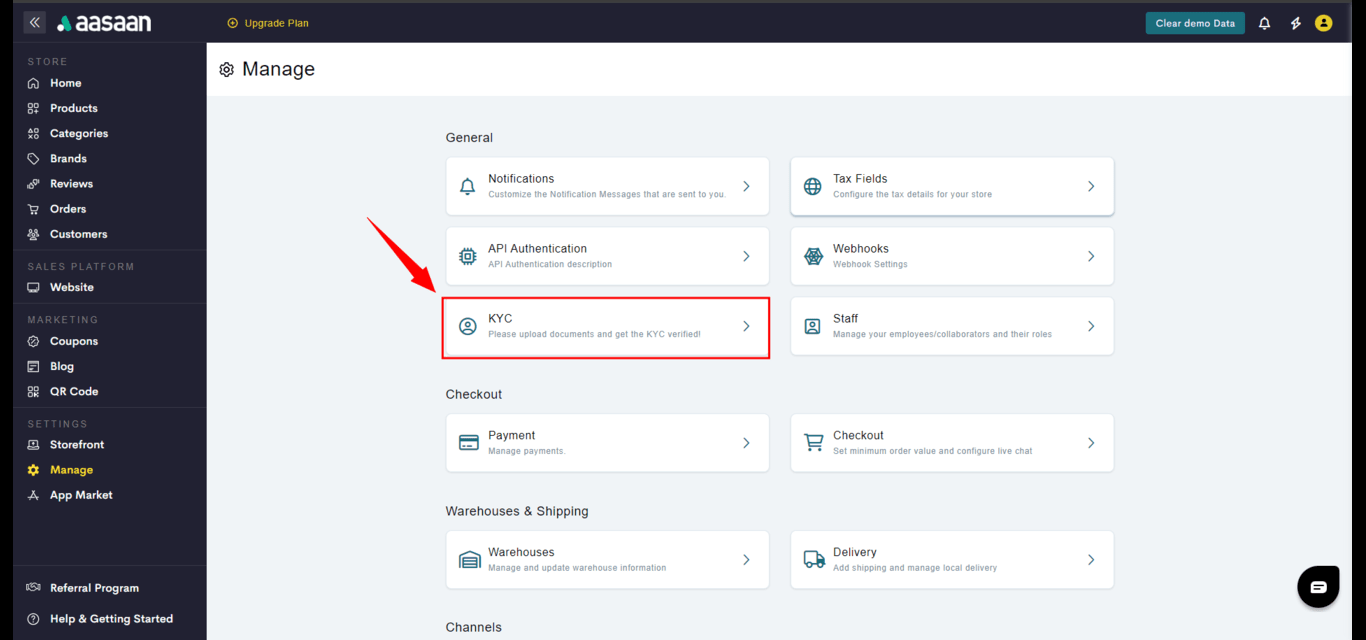 You can use aasaan to sell your products on different online sales channels. Sales channels represent the different geographical regions where you sell your products. You can customize your product pricing, currency, taxes, warehouses, and shipping methods for each channel in your store. This feature is especially useful if you wish to launch your brand globally. For example, if you wish to sell in India and the United States, you can create the respective channels for both countries in your store, and customize the currency, tax rates, and other details for each channel.The steps for creating channels in your store are as follows:STEP 1: