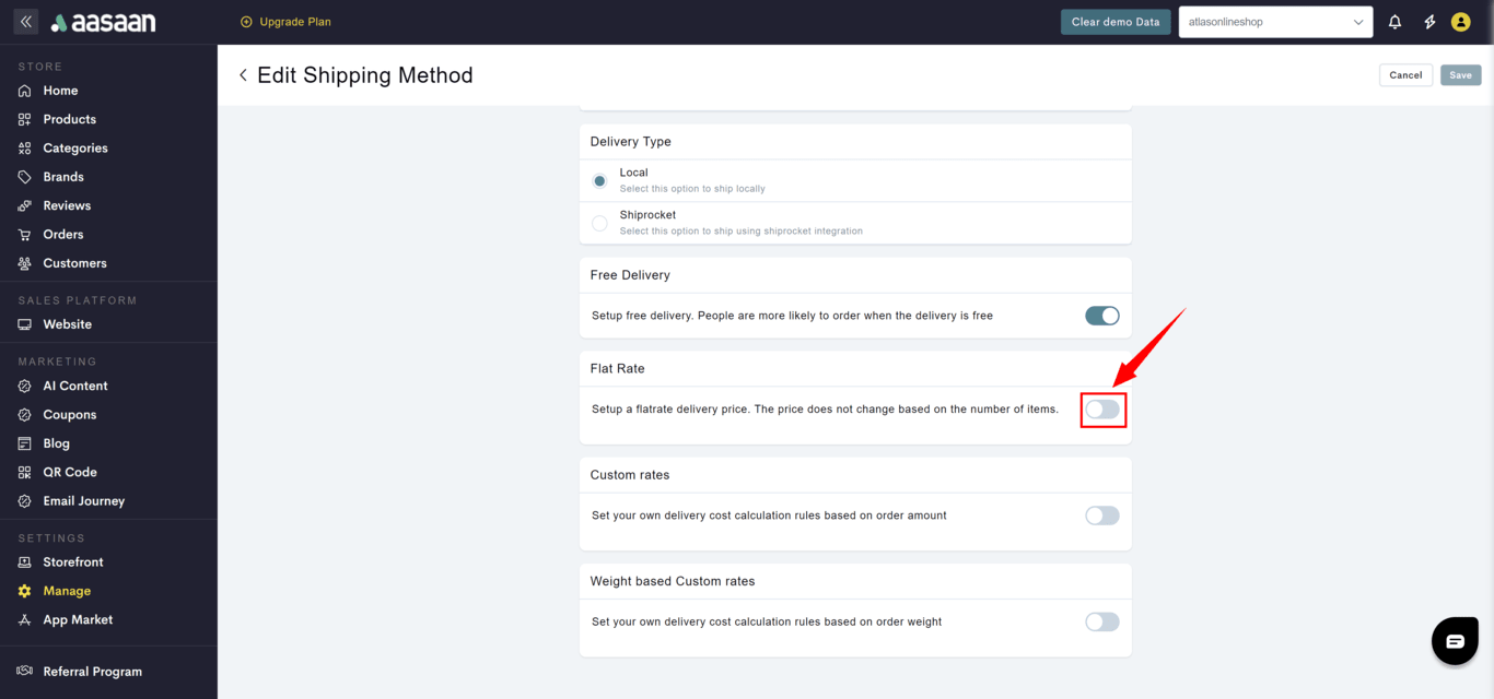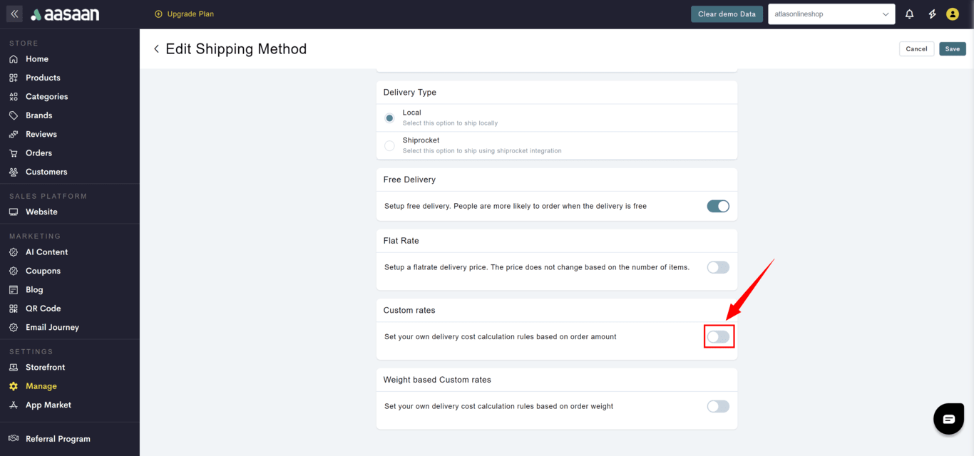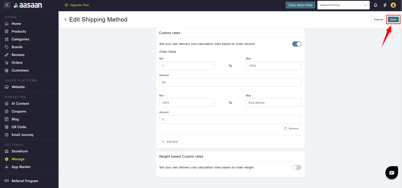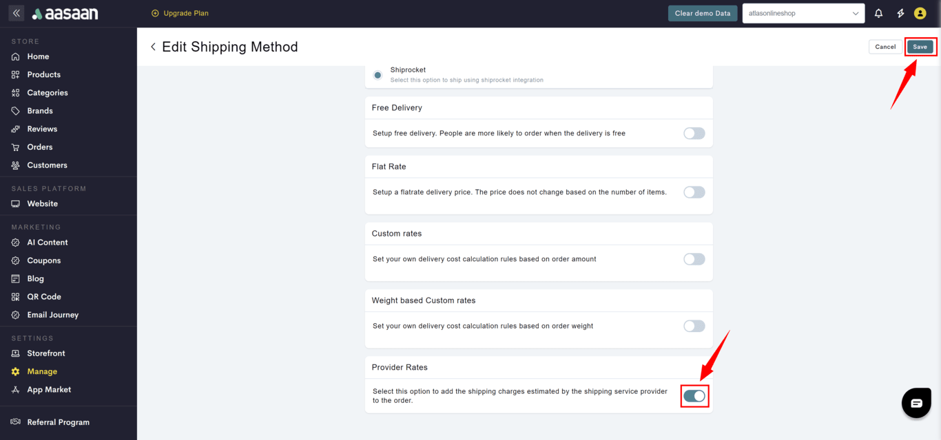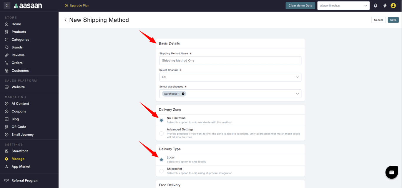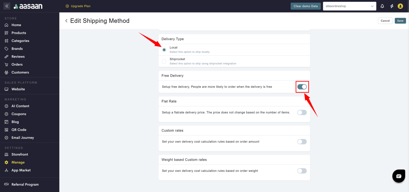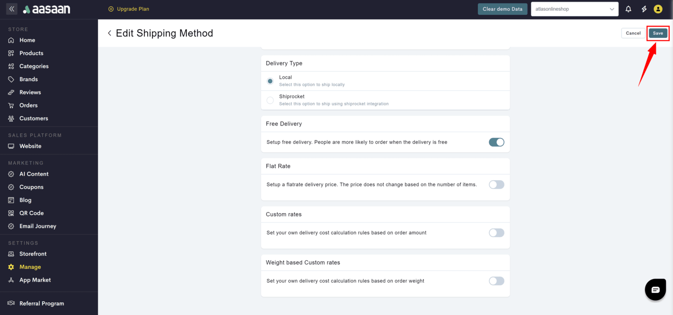 Since the Free Delivery toggle is enabled by default, click on Save.