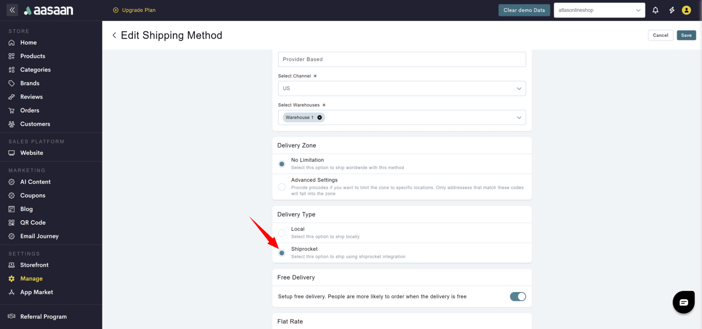 Enter the shipping method details (name and warehouse). Then specify the delivery zone. Since we are applying this shipping method worldwide, we will select No Limitation. Finally, we will select the delivery type. Here we will select Local. You can choose a shipping integration like Shiprocket if you prefer.