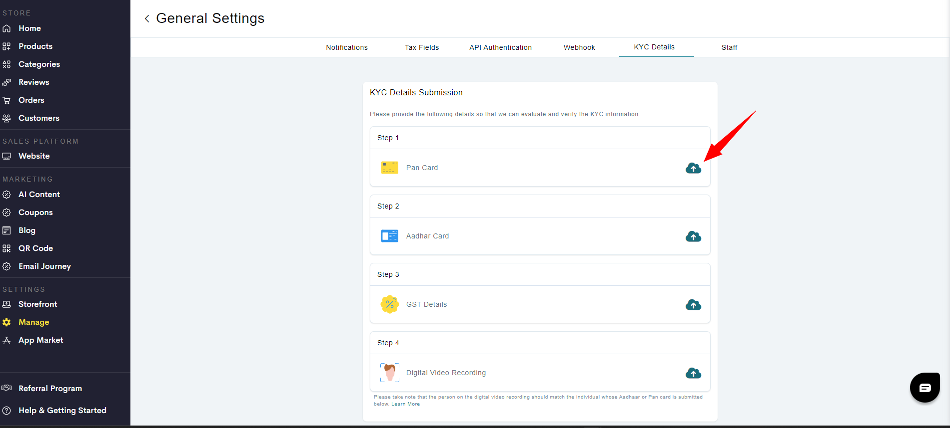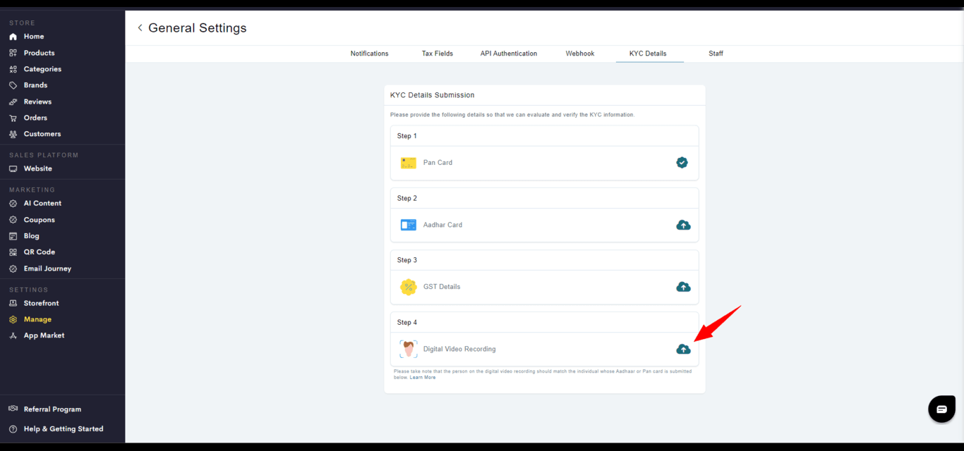 In this section, you will learn how to manage notifications, tax fields, API authentication, Webhooks, KYC and staff settings.Notifications