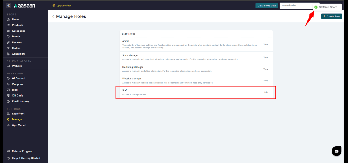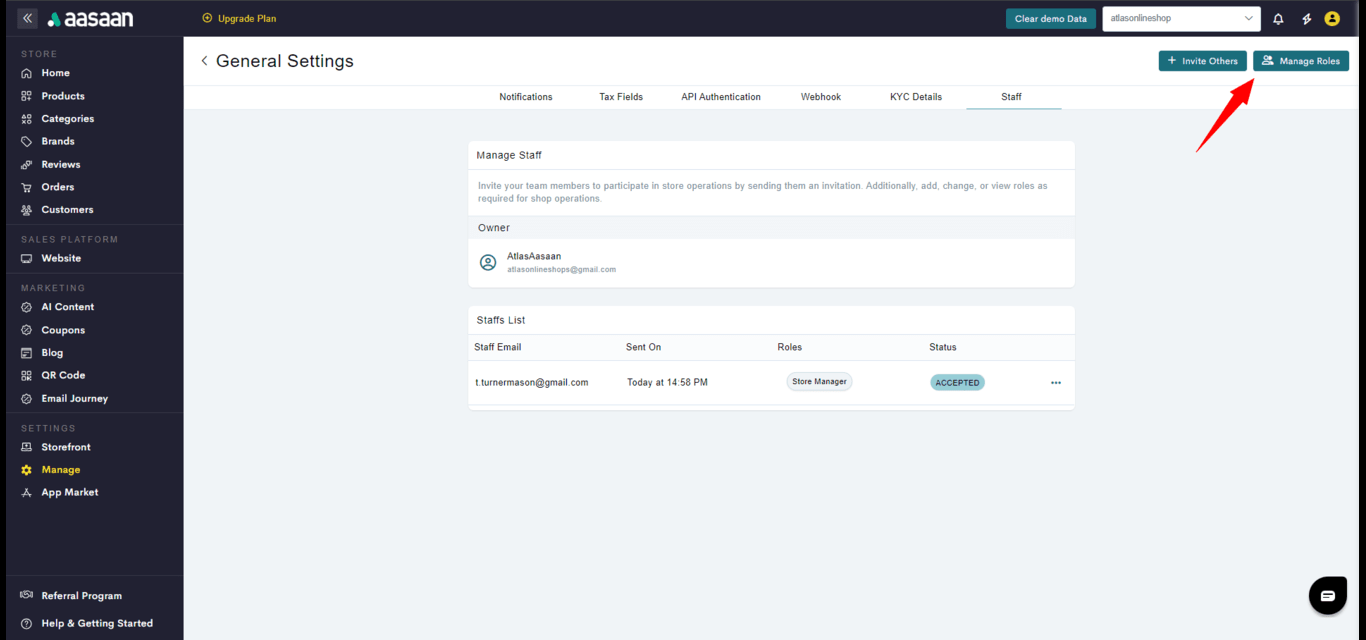As a store owner, you can add staff members to your so that they can complete specific tasks in the admin panel. You can determine what sections of your store they get to access by assigning them specific roles. Furthermore, you can also create custom roles to fit your business needs. In this section, you will learn how to add staff members and create custom roles for them in your admin panel.Manage Staff