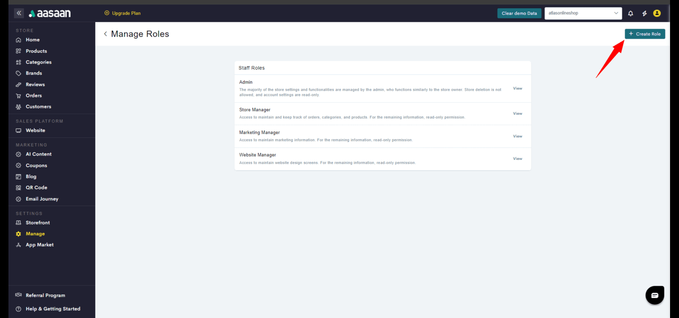 Assign a particular role to the staff member. Each role has specified permissions; they are allowed to manage/view only certain features. You can either use the pre-existing roles or create new roles of your own based on your needs.