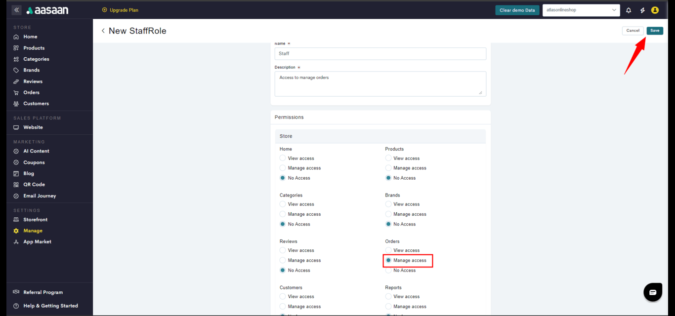 Here we will choose the role “Store Manager”. Check that box and click on Save.